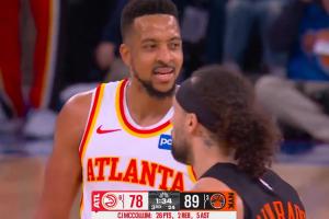 比赛第三节,老鹰球员CJ·麦科勒姆与尼克斯球员阿尔瓦拉多发生口角,双方吃到技犯。尼克斯主场球迷开始高呼:“F**k CJ。”